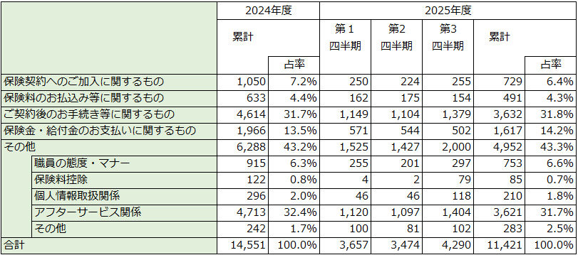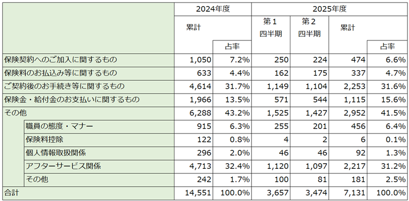2025年度にお客様から寄せられた苦情の件数等は以下の通りです。 個々のお申し出につきましては、真摯に対応させていただくとともに、それらの内容を分析し、 従来に増してサービス等の改善に努めてまいります。