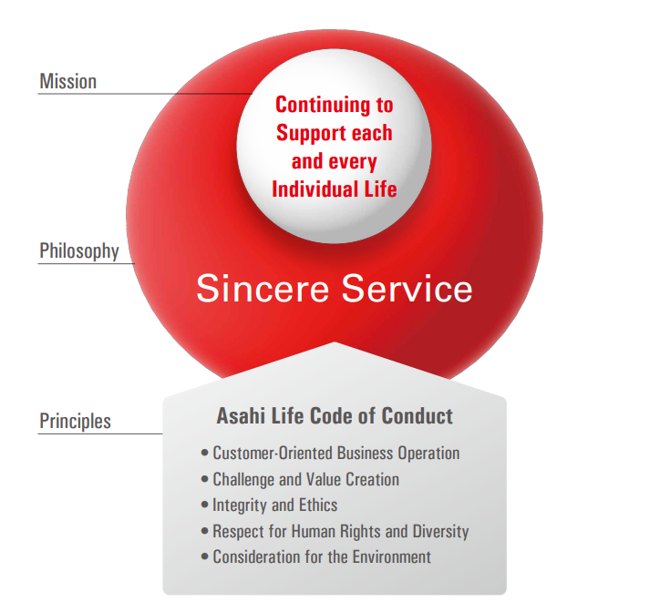 Our philosophy system consists of our Mission, “Continuing to Support each and every Individual Life,” and our Philosophy, “Sincere Service.” To guide our daily actions in realizing these principles, we have established the Asahi Life Code of Conduct as our Principles.