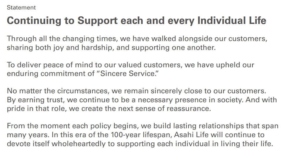 The Mission, “Continuing to Support each and every Individual Life,” is shared across the Group as the Asahi Life Group Mission, serving as the foundation for promoting group-wide management.