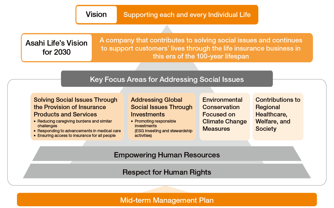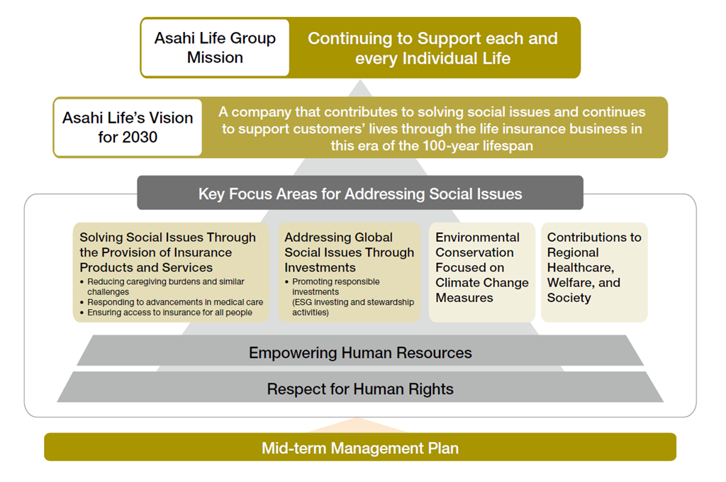 In promoting sustainability management, we focus on key areas based on "respect for human rights" and "human resource empowerment," including "solving social issues through the provision of insurance products and services," "addressing global social issues through investments," "environmental conservation focused on climate change measures," and "contributions to regional healthcare, welfare, and society."