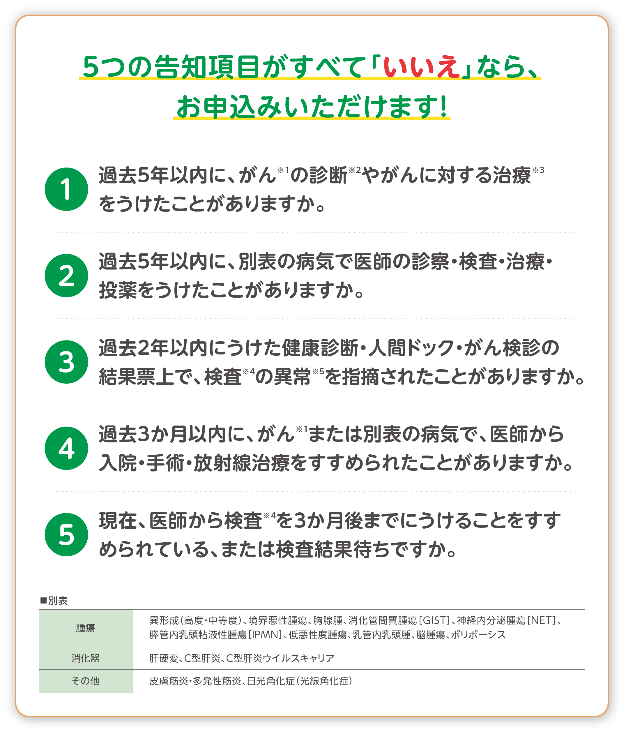 *告知がすべて「いいえ」の場合でも、ご職業、過去の契約状況等によりご加入いただけない場合があります。