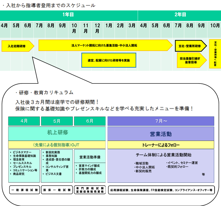 総合職(地域型)(募集職制)として入社、初期研修の後、約1年間職域基盤での従業員マーケット開拓を中心とした営業活動を実践し、【販売スキル・専門知識・対人折衝力】等を習得します。 2年目10月に総合職(地域型)へ移行、法人マーケットのスペシャリストとして、首都圏支社の育成スタッフとして配置、営業職員の職域法人マーケット開拓力強化に向けた指導を行います。配属以降は、営業所長等のライン職や新たな業務への挑戦等のステップアップを目指します。